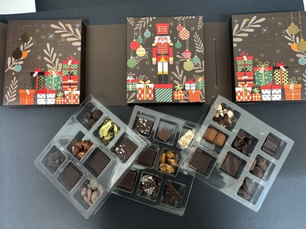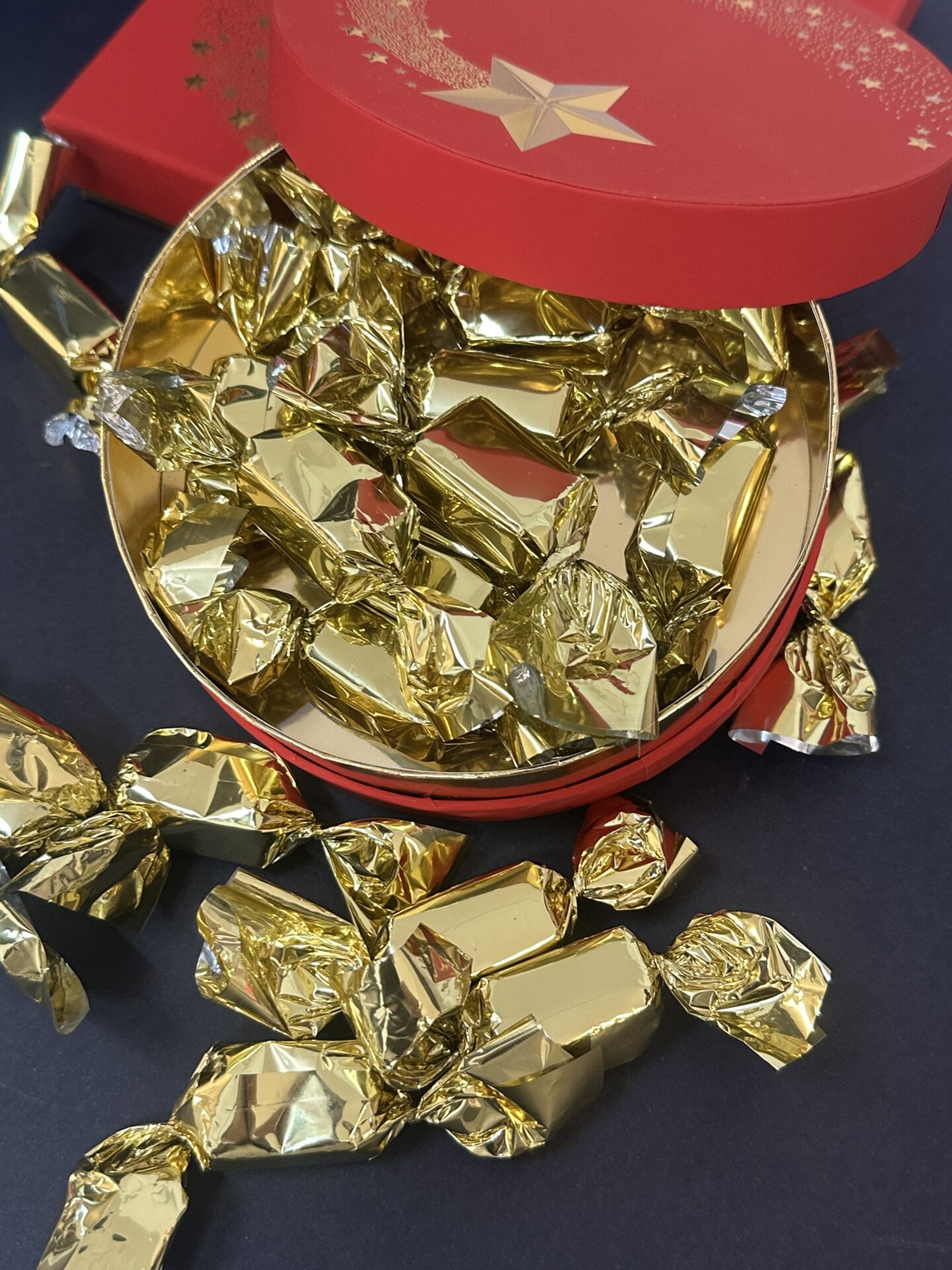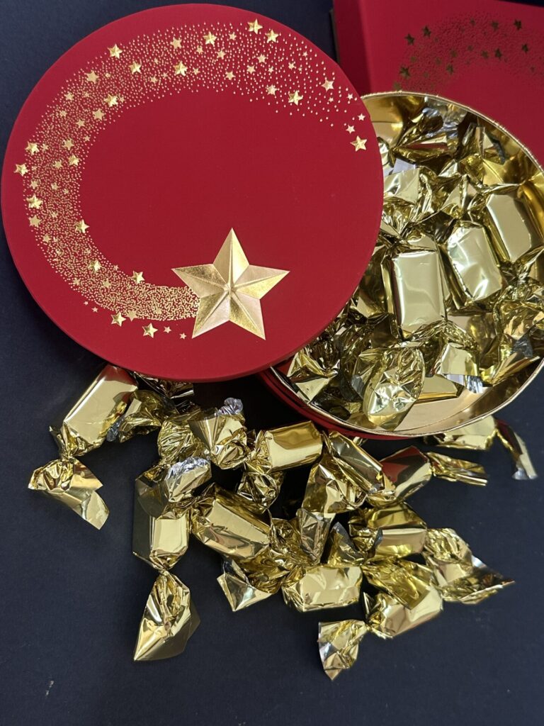Un embossage sur certaines étoiles donnent un côté festif et précieux à ce magnifique coffret, dégustation de papillotes au praliné noisette.