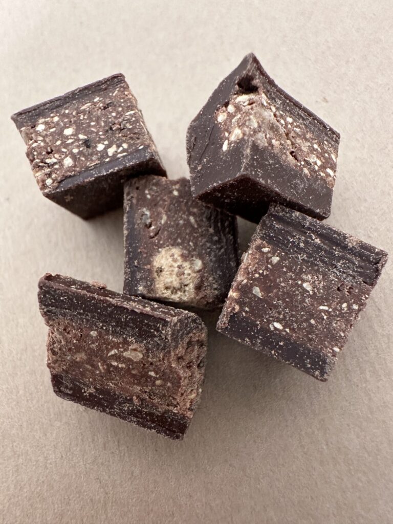 Un chocolat noir profond, ponctué d’éclats de noisettes torréfiées.