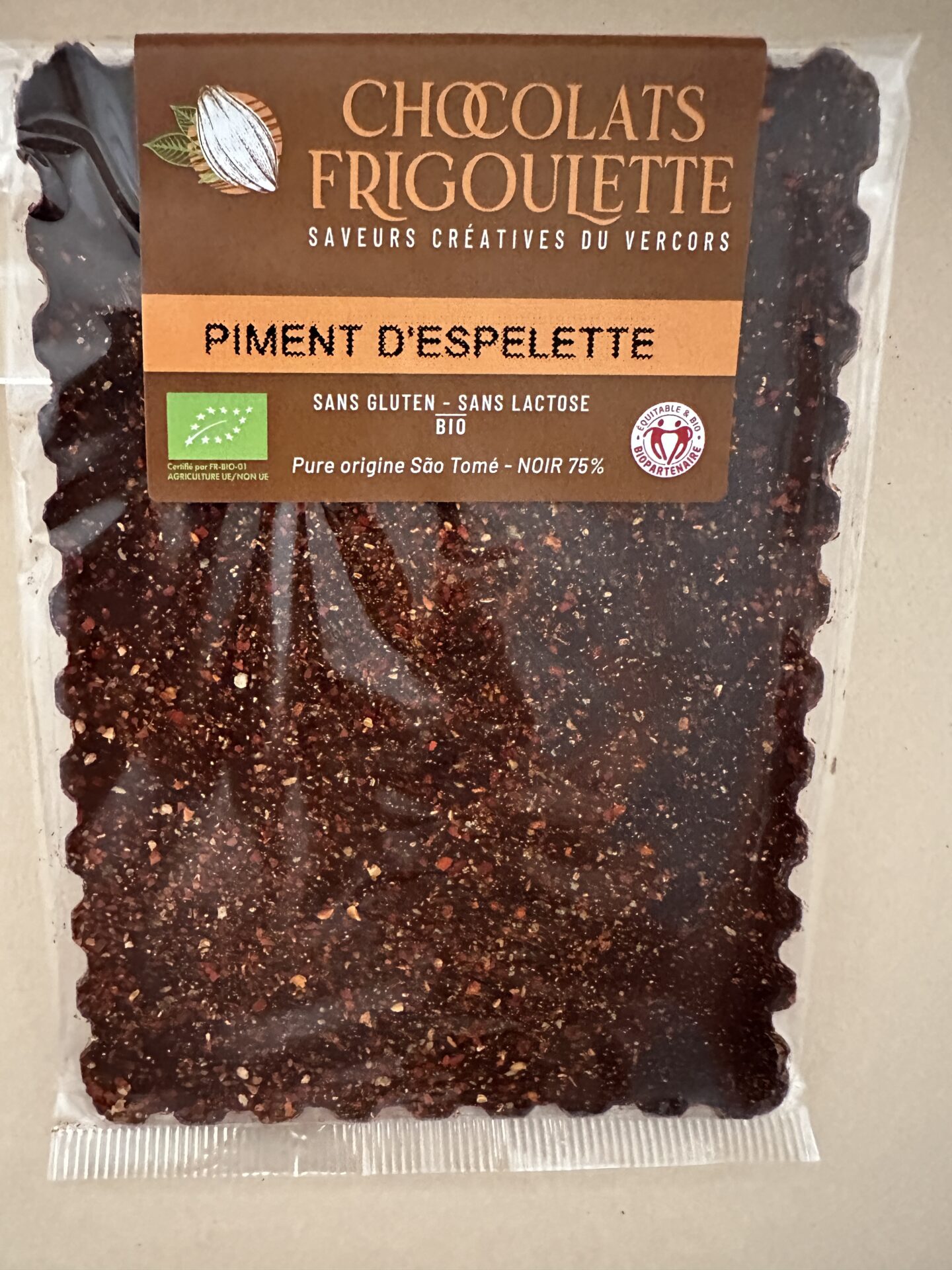 Chocolat noir*°(Pâte de cacao São Tomé*°, sucre de canne*°, beurre de cacao *°), piment d’Espelette *0,5%